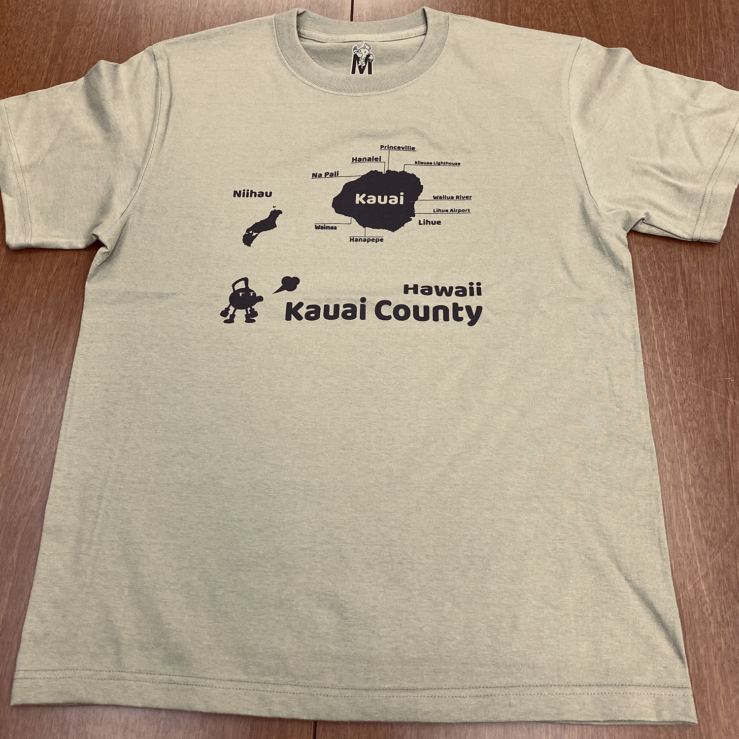 へなTシャツの値段が高くなってて、調子に乗ってたらあかんで!とのメールをいただいたので、原価を抑えた単色バージョンを作ってみました。単色で何が描けるか? 悩んだ結果、カウアイ・カウンティ(カウアイ郡/ニイハウ島とカウアイ島)を描いてみました。カウアイ島の枯れた感じを表現するために、カーキ色にしてみました。
