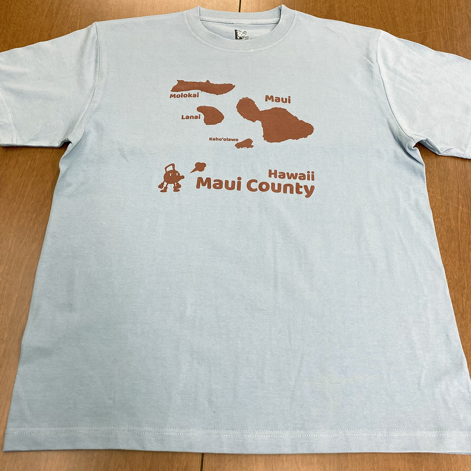 へなTシャツの値段が高くなってて、調子に乗ってたらあかんで!とのメールをいただいたので、原価を抑えた単色バージョンを作ってみました。単色で何が描けるか? 悩んだ結果、マウイ・カウンティ(マウイ郡/マウイ島、ラナイ島、モロカイ島、カホオラヴェ島)を描いてみました。最初にマウイ郡のTシャツをつくろう!と決まった時に、まず浮かんだのがこの色でした。