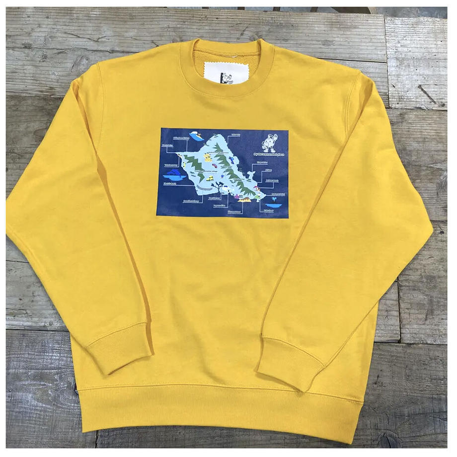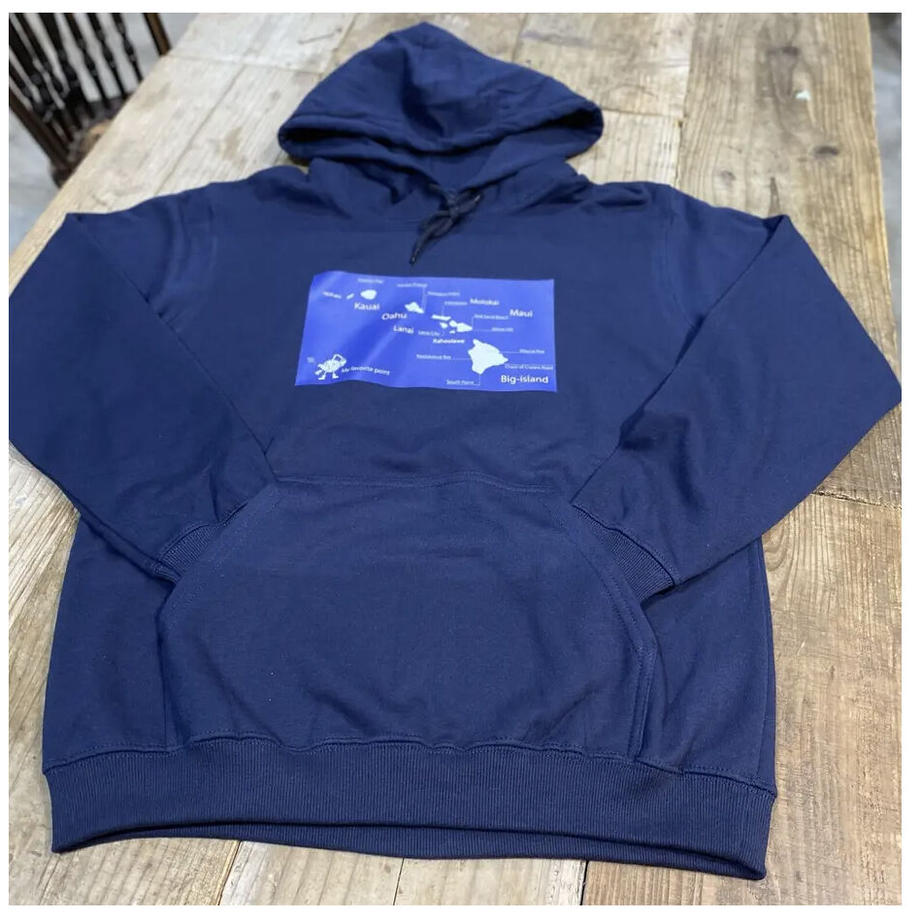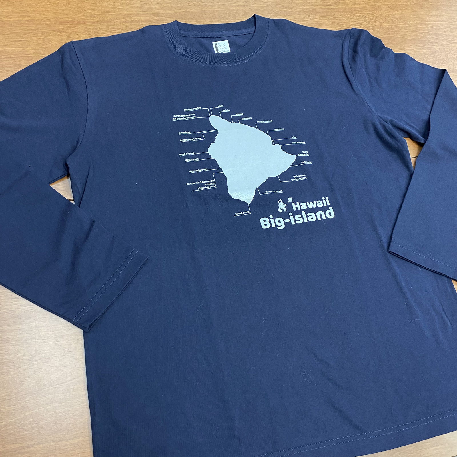 へなしゅんが大好きなハワイ島を、これまた大好きな袖口が詰まってないタイプの長袖Tシャツに描いてみました。ちょっと気に入ってしまったので、2色作ってしまいました。こちらはネイビーです。島のまわりに書かれているのは、ハワイ島海岸線沿いの行くべしポイント。