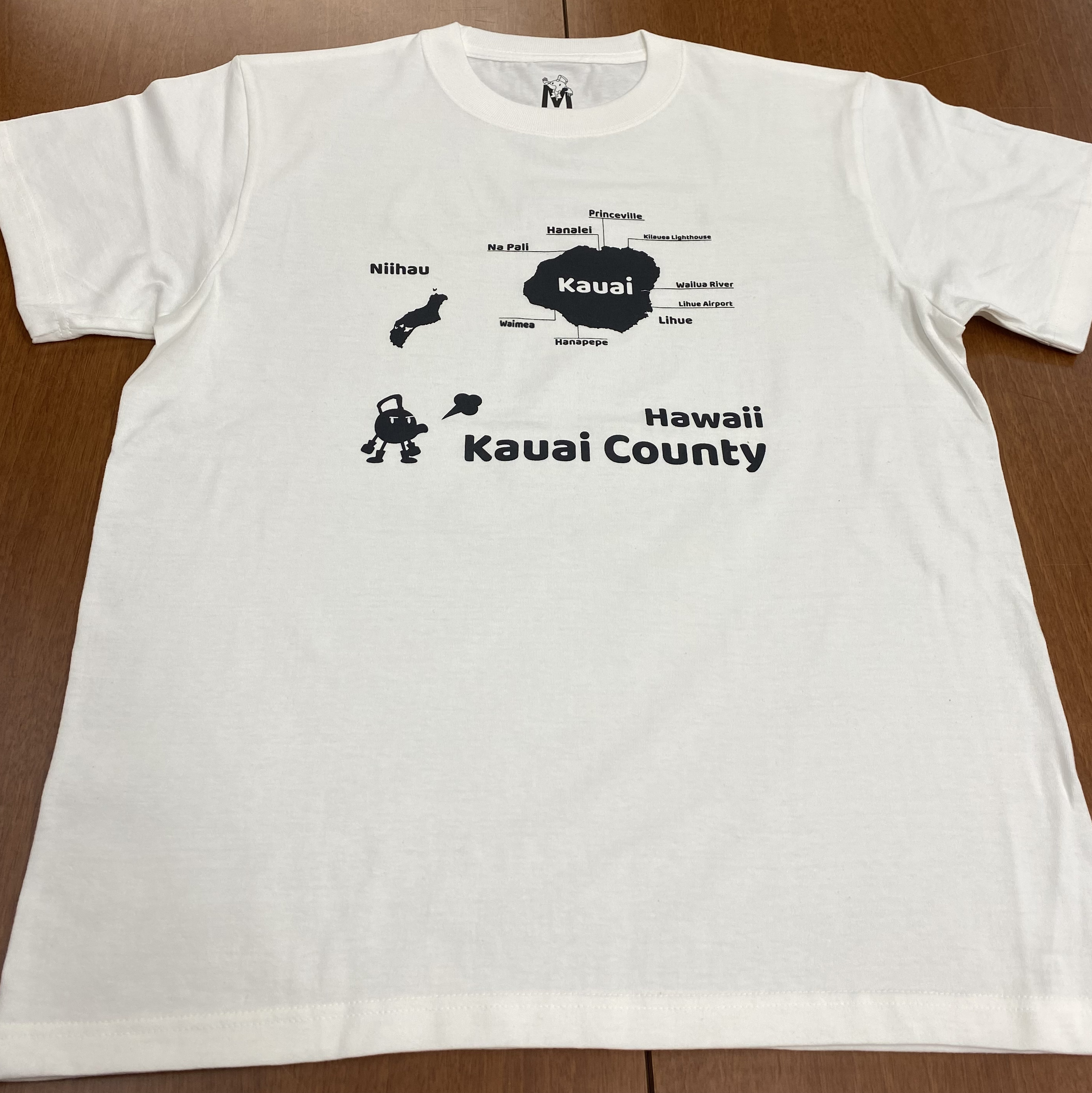 へなTシャツの値段が高くなってて、調子に乗ってたらあかんで!とのメールをいただいたので、原価を抑えた単色バージョンを作ってみました。単色で何が描けるか? 悩んだ結果、カウアイ・カウンティ(カウアイ郡/ニイハウ島とカウアイ島)を描いてみました。素朴で優しいカウアイ島の雰囲気を伝えるために、あたたかみのある白色にしてみました。