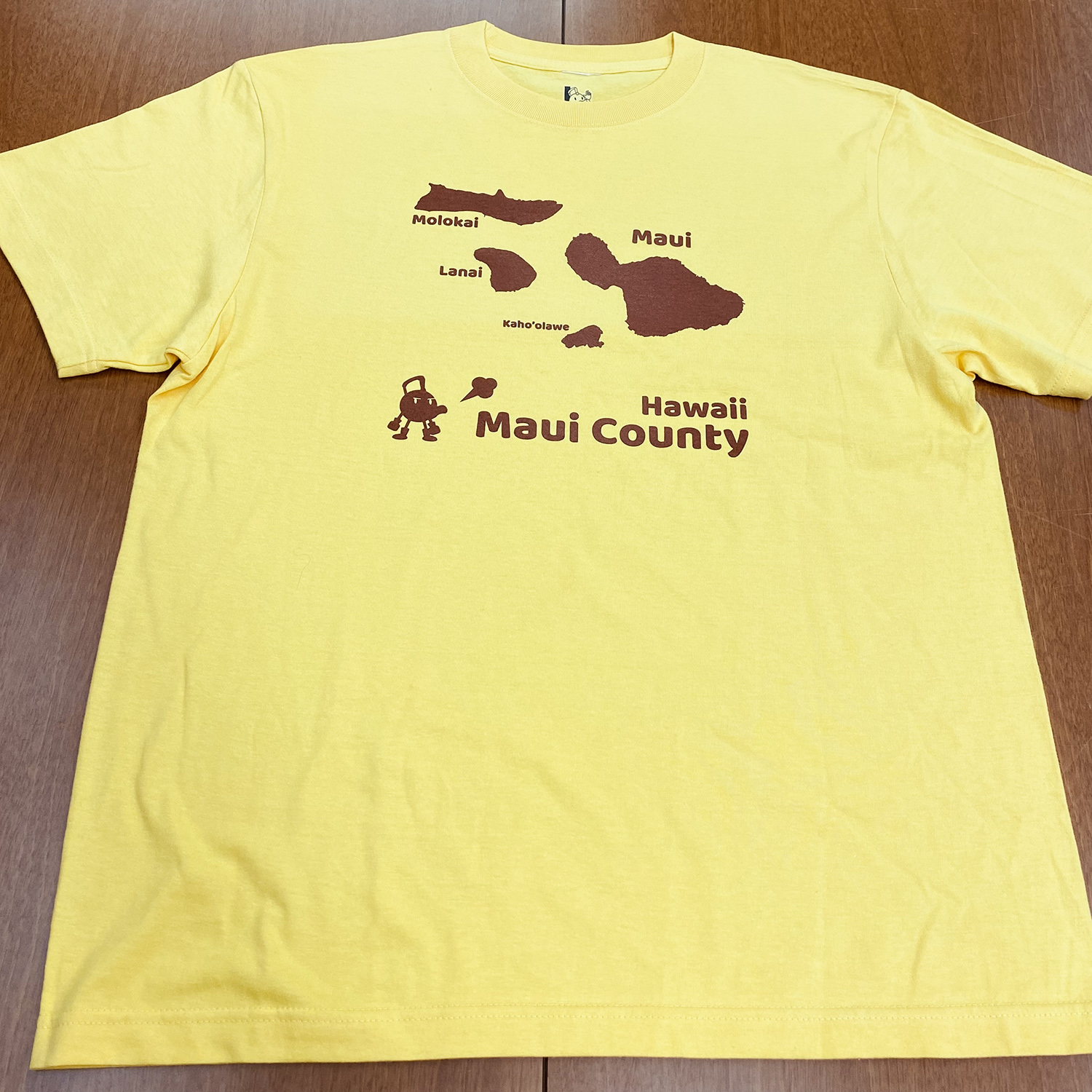 へなTシャツの値段が高くなってて、調子に乗ってたらあかんで!とのメールをいただいたので、原価を抑えた単色バージョンを作ってみました。単色で何が描けるか? 悩んだ結果、マウイ・カウンティ(マウイ郡/マウイ島、ラナイ島、モロカイ島、カホオラヴェ島)を描いてみました。最初にマウイ郡のTシャツをつくろう!と決まった時に、まず浮かんだのがこの色でした。